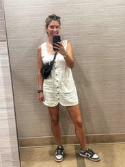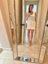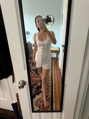 This dress is a perfect go-to for summer—lightweight, flattering, and easy to wear. It fits true to size and is especially comfortable through the hips and waist. As a 34DD, I appreciated that the top had good structure and didn’t gape between the buttons. The fabric is breathable but not see-through, which was a huge plus for a white dress. I’d definitely rent this again for a casual brunch, vacation, or a warm day out. But warning it is very short I’m only 5’4 and do you love a short dress or skirt but this could not be any shorter or it would not be appropriate.