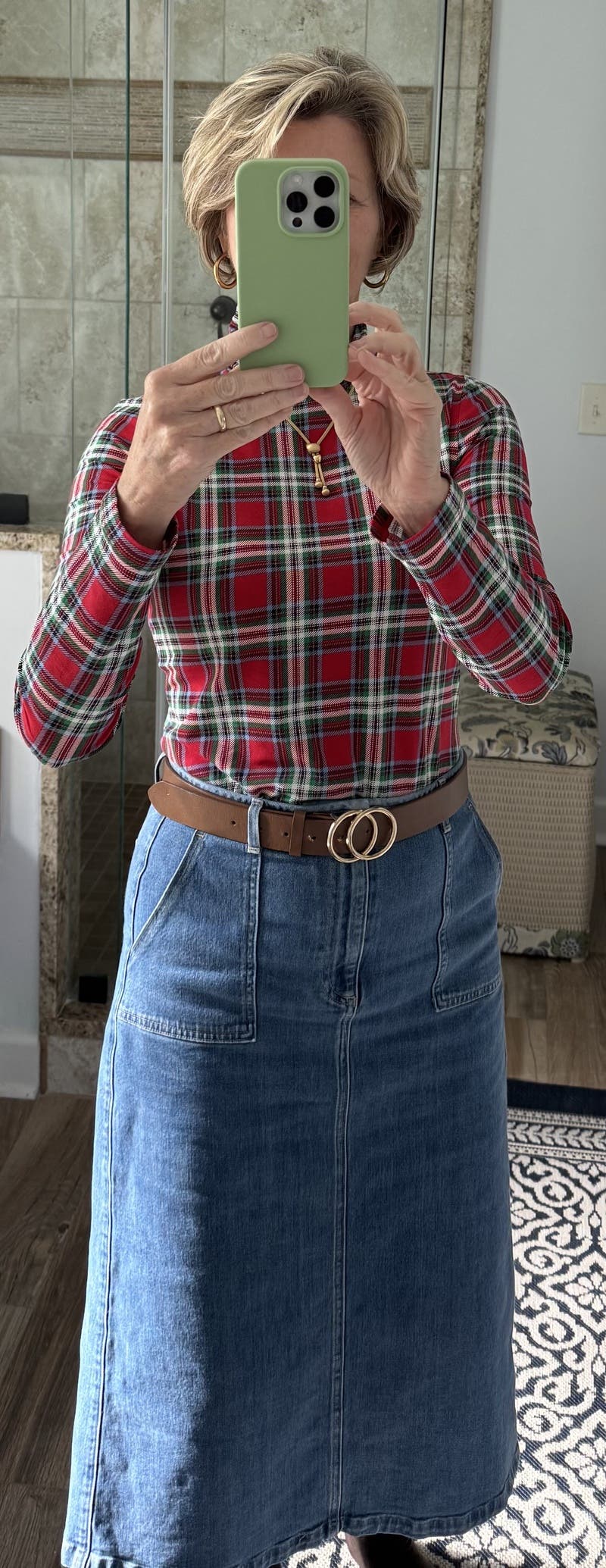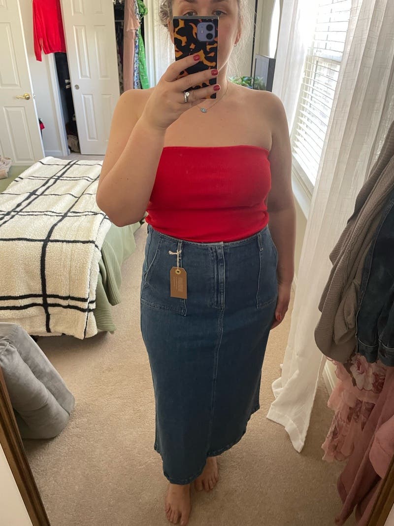 This LE JEAN denim skirt emanates a timeless, casual-chic vibe with its classic A-line midi cut. Elevate the look with a crisp blazer and strappy heels, or keep it laid-back with a simple tee and sneakers.