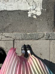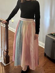 Wow! I love this skirt! One thing I didn’t realize is that there is a black stripe on the pleats so you can totally wear with black. It was down to my ankles as a 5’2” girlie. Probably would have been cuter if I was a bit taller but no issues.