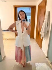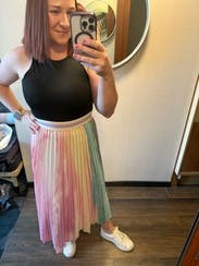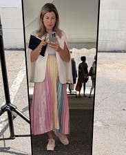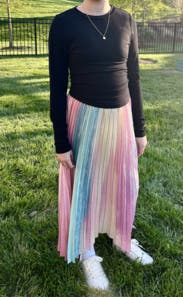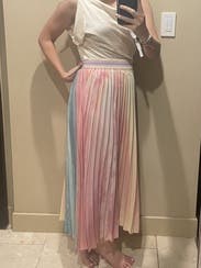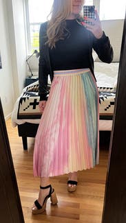 Loved this skirt - very fun and cute spring vibes. Wore to work and got so many compliments. Would definitely rent again. I am 5'6" and 150 lbs and the medium was a perfect fit. The pleating is very flattering, and I loved how the skirt fell.