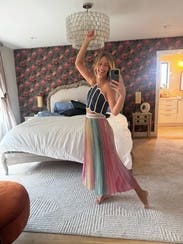 This skirt was so colorful and comfortable! It was a little longer than I anticipated so shorter girls may find it to be more of a maxi skirt than midi length. I got so many compliments every time I wore it. A perfect statement piece to rent and not necessarily own!