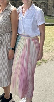 Beautiful, light skirt. Very sheer- opted for a slip underneath. Love the band on the skirt. Occasionally I feel like skirts with these pleats make me look wider but I didn't feel that with this skirt.