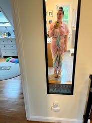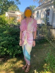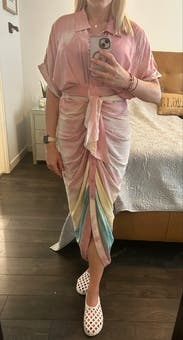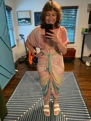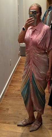 First the colors: I mean, they are amazing! I wanted to wear this for Easter so I foolishly pretended that those were colors that work for me, when they are not at all! A triumph of hope over experience. Again.🤷♀️😉 Next, the shape: so unusual, and I hoped that the ruching would camouflage my spare tire, which is where almost all of my excess weight is. Unfortunately, it really emphasized it instead. Bottom line, a really nice and different dress that didn’t work for me, unfortunately.