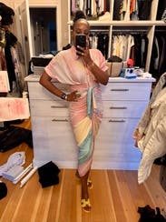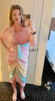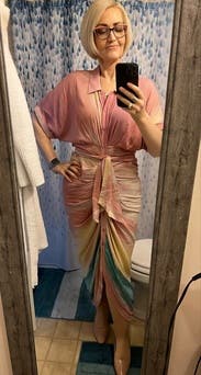 Not only did the phenomenal colors (photos can’t do justice!) of such happiness receive endless and the most kindest compliments, but I adored every moment wearing such a colorful, sensationally happy, and superbly gorgeous dress! Couldn’t find a more magnificent blend of stylish “Sar Bear” fashion and business casual for our NW Rare Disease Coalition’s Payers Forum! 💕🦓🫶🏼 I found TTS, although it needed a steam to reach it’s ultimate peak beauty after shipping-as expected, but truly GORGEOUS dress, exceptionally so with its stunning light vibrant colors, draping but fitted design and tailoring, petite-friendliness, and OBSESSED with the curved front of the skirt and beloved curve highlighting belted design-especially sitting in my wheelchair and standing! Loved how easy it was wearing to our NW Rare work event, then to our fancy pants group dinner; a breeze to style up or down-day to night. Cannot recommend this gem 💎 of a RTR find enough! It’s hard to stand out and be memorable discussing how we can empower payers (insurance companies) to provide better care for all known 10,000 Rare Diseases including my type of EDS, Vascular Ehlers-Danlos Syndrome and Stickler Syndrome rare types of Connective Tissue Disease, but this outfit did the absolute trick making easy & organic connections & networking through the kindest style and disability fashion conventions-a brilliant win! 💚🫶🏼💕 I ❤️ how approachable I feel wearing RTR, especially when I’m using my wheelchair, turning around my self-doubt or feeling of being “othered” into confidence and self-esteem that only continues to grow! I’m forever grateful and blessed for RTR helping me find the chicest and most gorgeous items adaptable for me, my symptoms, disability, style, and self-expression everyday. ❤️🙏🏼👗🫶🏼💕