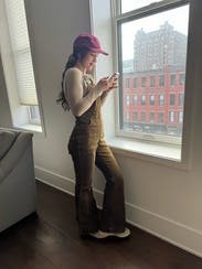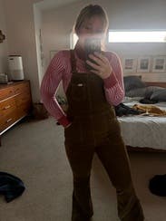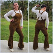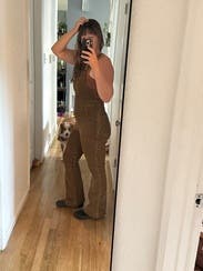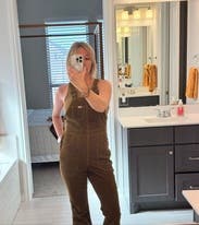 Ok, I really like these corduroy overalls, but just know that if you have any insecurities about your midsection, there's no hiding it if you go TTS in these, and the way they are made, I don't think they're supposed to be baggy (they're made to be more fitted). It was mainly that reason I didn't purchase them. They are SO cute, but if I gained five pounds, they might not be as cute--does that make sense? But I HIGHLY recommend renting them!!