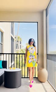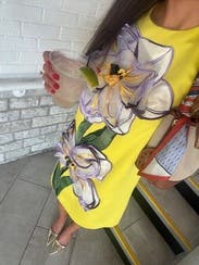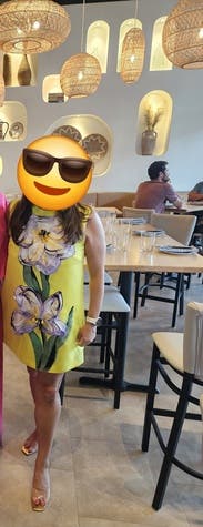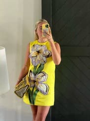 One of my favorite event rentals ever. Such a stunning yellow color. I received endless compliments on this dress. It’s perfect for a work party where you want to feel chic but conservative. The flower appliqué is so gorgeous in person. Perfect length. It’s a little boxy/roomy in the waist if you have a smaller frame but the Leo Lin size 8 was perfect for me. The smaller size 6 was too tight in the arms/shoulders.