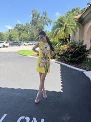 This dress turns heads! Beautiful material, color, and floral design. Total package!!!