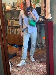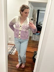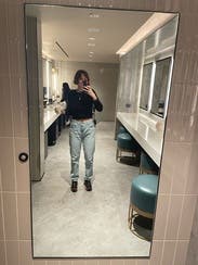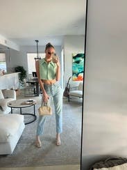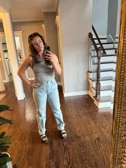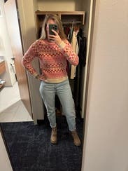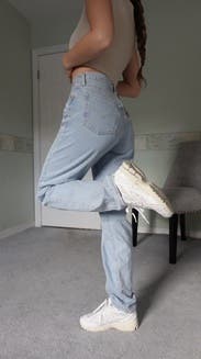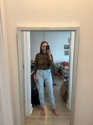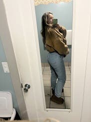 Very ‘mom’ mom jeans. I rented these a while ago when I was 10 weeks postpartum and couldn’t dream of buttoning them up even 3 sizes up. These are one size up than my usual these days and they’re tight in the waist but make a pooch, a little long and have no stretch. Like I wore them because I was too lazy to change but I wouldn’t rent again.