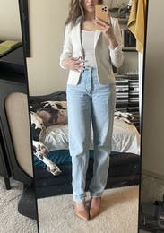 Relaxed fit kind of “mom jean” vibe but still cute and flattering fit. I’ve worn this casually and dressed up for work with the blazer.