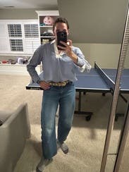 I got so many compliments on these jeans! I could’ve gone down a size. I love the two tone and the waistband is so cute.