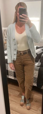 These Levi’s corduroys fit perfectly — length, butt, loose legs. It’s so hard for me to find pants being short and curvy. They match so many things too!