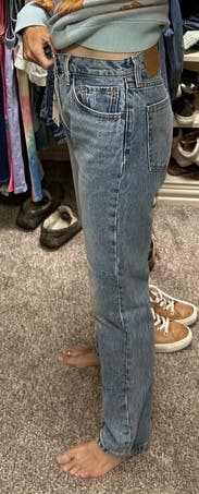 These are Levi’s that run a little stiff and small so size up if you’re in between. They are pretty short but look fine with sneakers.