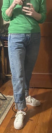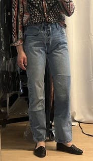 I love Levi's style but haaaate their sizing! The patchwork was really cool on them and made my butt look like I had one. These were very rigid denim and fit snug even through the thighs (which I rarely have an issue with). They did ease a little bit after the first wear but not much. For reference, I'm in between a 12 & 14 and Madewell 31s fit me perfectly. These fit like a small 12. I could wear them, but they were def Standing Jeans.