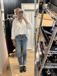Pockets are functional | Buttons are functional | Petite friendly | Tall girl approved | Mid-weight | Functional front buttons | Front zipper | No stretch | Tighter fit | If in between sizes, size up