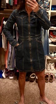 Blue (98% Cotton, 2% Elastane). Casual dress. Collared. Long Sleeve. Zipper front closure. Shoulder to hemline: 31". Imported.