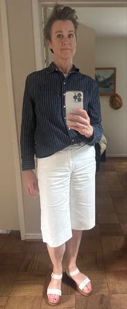 Great casual top, fit TTS. Could dress it up (if I steamed/ironed it) but it was great work from home.