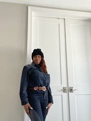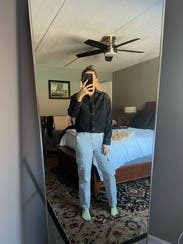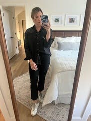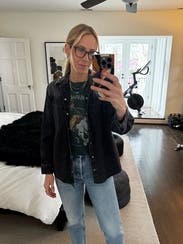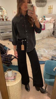 Loved this top with the matching jean set. It’s meant to be oversized, so if in between sizes, go with the smaller size.