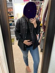 I wore the large while 30 weeks pregnant. Nice, fun layer to add to your day’s outfit if a little chilly outside. Western vibe, but not over the top.