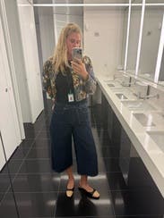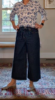Very cute jeans on. Fit nicely around the waist but the tie was a little tricky to keep tied. Probably recommend for the taller girlies just based on the cut. These culottes give the same idea as barrel jeans without the funky shape.