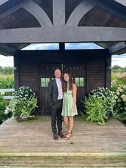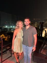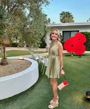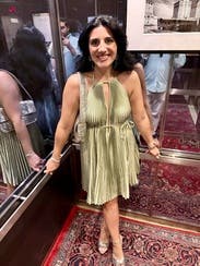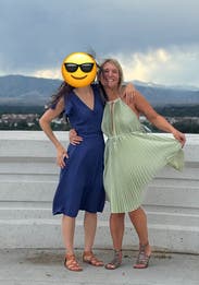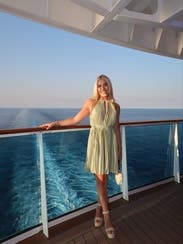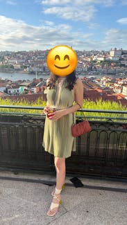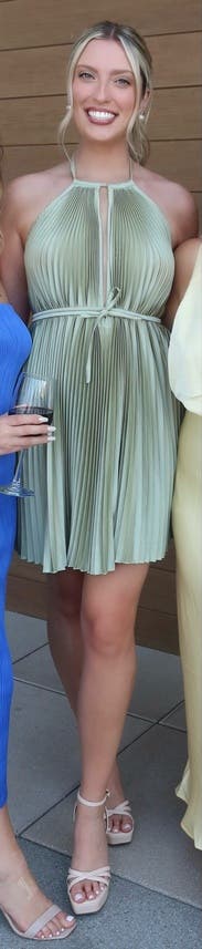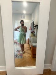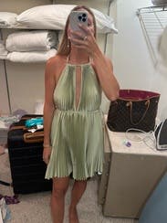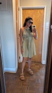 Reyes for dinner for my 5 year anniversary and loved it! Easy to eat without a restricting belt or waistband. The color is gorgeous in person and it draped so well. I ordered my regular size and one size up for the backup size but I wish I sized down, this style is really roomy. A must rent!