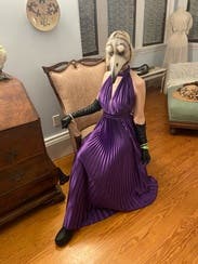 Purple pleated (100% high-grade polyester). Gown. Sleeveless. V-neck. Back zipper closure. 55.5" from shoulder to hemline. Imported.