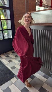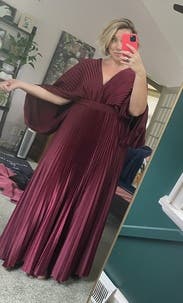 I was a bit hesitant with this dress but it turned out to be wonderful. Wore it to a work gala event. It’s slightly sexy, but still very sophisticated. The pleats are very flattering and the color was just right. It’s a bit heavy but I wore it for about 5 hours and it was comfy.