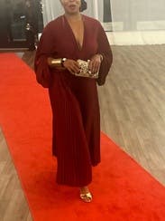 First of all, it travels beautifully. I attended my bestie’s military ball right after a wedding so I had to change in the car between events. Easy to style. This gown does all the heavy lifting. I received so many compliments and felt covered in all the right places. I’m an average size 10 and got the petite large. I wore a burgundy body suit underneath and recommend fashion tape to keep the neckline from traveling. I forgot it and messed with the drape all evening. 10/10 would rent again and execute better.