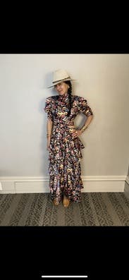 Such a unique and beautiful dress and I got so many compliments on it! The dress fit very nicely and was true to my actual dress size (size 2). I wore this dress to an April wedding that was on the beach - kept me warm on a cooler/windier spring day. Flower pattern is bold and springy so would advise low key accessories! You honestly don’t need to accessorize this piece at all :)! The only feedback I had was the little belt didn’t stay looped because the fabric is very soft and silky so you might need a Bobbi pin or actual pin to keep it pinned to the other side. Other than that it was a great option for me for a friends wedding