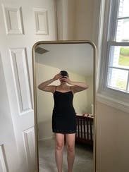 I absolutely LOVED this dress! I tried it on the day I got it and honestly wore it around my house just because I felt so pretty in it. I wore the dress to a college formal. The dress is pretty short but I never felt like it was riding up and showing my butt at any point. I also wore bra pads with the dress just because I lack a bit in that area but I honestly couldve been fine without it. I 100% would rent this dress again!!