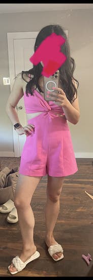 cute romper. pretty basic shape but bold, barbie color made it fun to wear. recommend for petites.!