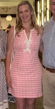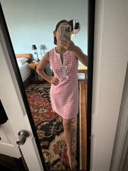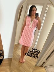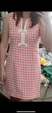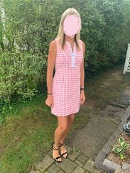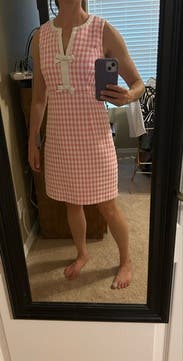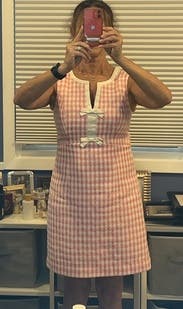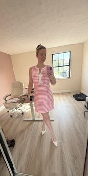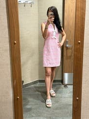 This dress is simply cute! The pink-and-white check pattern adds a cheerful touch. I paired it with white pointed-toe heels for a clean finish. The fit is true to size, and the sleeveless cut makes it ideal for warmer days or layering under a blazer. It’s a great option for work, daytime events, or anywhere you want to show up looking polished with a playful twist.