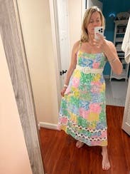 I wore this to my friend’s baby shower and got so many compliments from it! The square neckline is so flattering and modern, while the sleeveless design keeps you cool and comfortable. The midi length hits at just the right spot - elegant but not too formal. This dress is everything you want in a summer midi - fun, flattering, and effortlessly chic. But the colors especially on this dress make you look (and feel) more put together with a pop of personality.