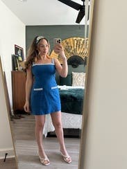Very flattering and summery. Was a colder day when I decided to wear it and actually looked really cute with a sweater on top. Straps were a bit big since I’m short waisted, otherwise very flattering fit. I would have purchased if a little cheaper as the material did have a little give and didn’t want to stretch. Would rent again!