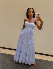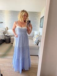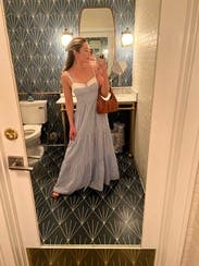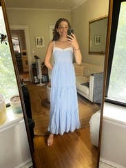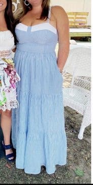 I passed this dress without hearting it and then saw an ambassador in it and it looked phenomenal on her. The dress is really beautiful in person. It's a nautical simple maxi with little details that make you fall in love with it. I would rent again