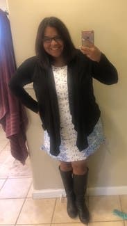 I was worried this would be too tight, but it fit really well. Thicker material, and the length was perfect on me. I liked the appliqué running down the front because I feel like it hid my stomach.