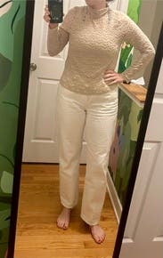 Loved the fit and feel of this top! Wore to work with flared black plaid trousers and nude cami and got lots of compliments. The only thing keeping me from buying is the mock turtleneck wasn’t structured enough to stay up and dropped. Not sure if it was stretched out or just that way. The three pearl buttons in back begged for an updo.