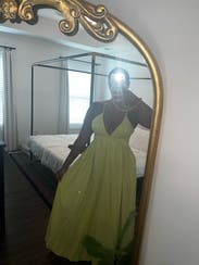 Green cotton blend (90% Cotton, 10% Linen). Maxi. Sleeveless. V-neck. Back zipper closure. 57" from shoulder to hemline. Imported.