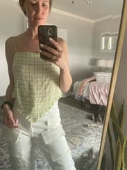 Pretty plaid patterns this scarf-style Line + Dot top that ties at the back and is a go-to for hot days and warm nights.