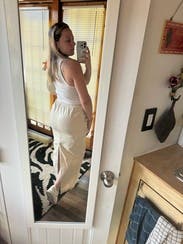 I like the flare at the bottom, the length, and the color. The waist strings were not through the right holes so they wouldn’t tighten and I didn’t take the time to fix it. Cute with tennies and a Jean jacket.
