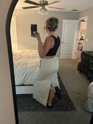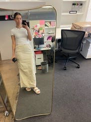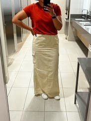 I love the styling of this cargo skirt and the slit in the back helps with walking but it was odd in the hips and waist area, didn’t quite fit right but nothing to me from wearing it twice and getting many compliments!