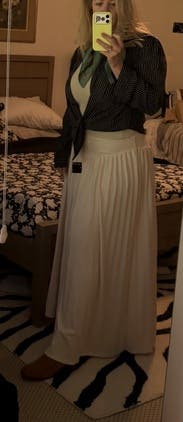 Love this skirt; feels luxurious yet light. I washed it to wear again and washed beautifully with dirt spots on end of skirt coming right out. Its a little long for my 5’6” height so wore wedges and was spot on perfect. Feel goddess-like.