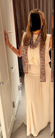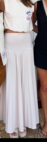 FYI, the inside of this draped tank is tight, so only certain bras worked under it for me. Overall very cute and looks effortlessly dressy. I wore it with a high waist maxi skirt (not the one from this set but a different RTR skirt).