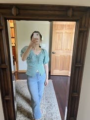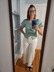 I probably should have sized up in this top since I'm breastfeeding right now and it seemed a little tight in the chest. Flattering top, material wrinkles easily though.