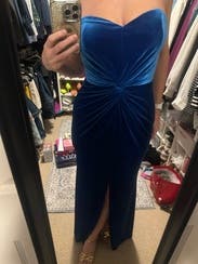 This dress fit perfectly! I wore a strapless bra and it stayed up all night. I only adjusted it a couple of times out of habit, but it really didn’t need it. The blue velvet color and texture were absolutely gorgeous, and I got so many compliments. I felt beautiful and confident wearing it.