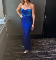 This was an eye-catching beautiful shade of blue, and was a perfect red carpet gown. It was a little large on me, and I was hoping a smaller size would become available during the week before the event, but I was so glad I wore it, and got several compliments. It's a little less formal, and I wore it to a daytime Hollywood awards show. I would rent this again!