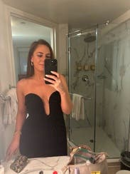 This dress was my backup dress so I didn’t end up wearing it (hence the picture) but wow this dress is beautiful! Thick, expensive fabric makes it feel wonderful on and makes your body look seamless. There is a rubber edge along the whole top neckline to help keep it from falling down- however, I did find it ran a little big.