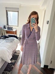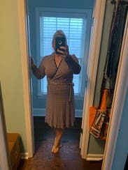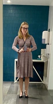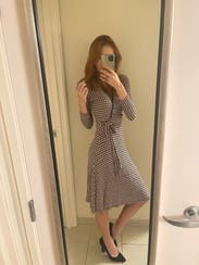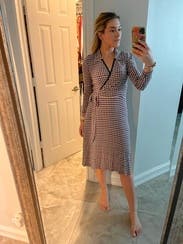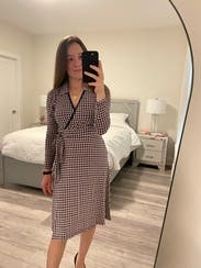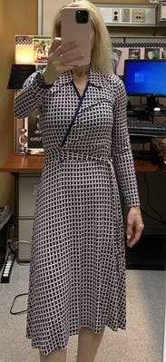 Wore this to work, tons of compliments. It's nice that it's a faux wrap so I didn't have to worry about the top opening or coming apart