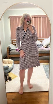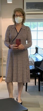 Love the fake wrap. I got away with just 1 pin instead of having to wear something under to hide my cleavage. Shape wear under to smooth things out. Light and comfy. I felt very mature; not a bad thing in this case 😆