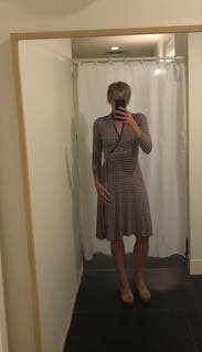 I originally got this for work, but felt it was a little too form fitting for the office. It is a lovely silhouette and quite flattering.