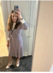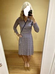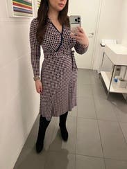 Loved this dress! Perfect length and style for work. One thing to note, the colors in this dress are beige, navy, and dark pink. It's hard to tell from the photos online. Loved the colors, loved the fit!